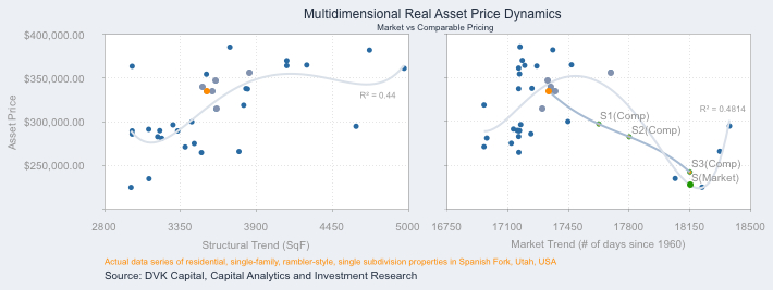 The problem of sales comparison appraisal becomes evident when an asset is evaluated in the passage of time. In the right panel, the light-blue trend line explains 48% of price fluctuations, precisely because there are other economic factors that affect real asset prices in time. (Note, it is not the time factor that affects real asset price; time only reflects changes in other real factors affecting asset pricing.) The darker blue trend line shows the price of an asset in time using sales comparison appraisal, which is based on sales of similar properties compared to the subject property identified by a green dot, S (Market). It is evident that if the subject property were evaluated at different points in time using sales comparison appraisal, the methodology would dramatically devalue the property compared to the actual market equilibrium price (see S1(Comp) and S2(Comp)) and only catch up, somewhat, with the market trend after about a year and a half. One of the reasons the sales comparison approach fails to price accurately real assets is that asset factors depreciation (or appreciation--the marginal effects)--in this example the structural factor--are evaluated by a linear function, a phenomenon which very seldom occurs in the real life and contradicts microeconomic theory. (Note, the actual price trend as it appears in the right panel may not be linear because it depends on weights of comparable properties assigned by appraisers during price reconciliation.)